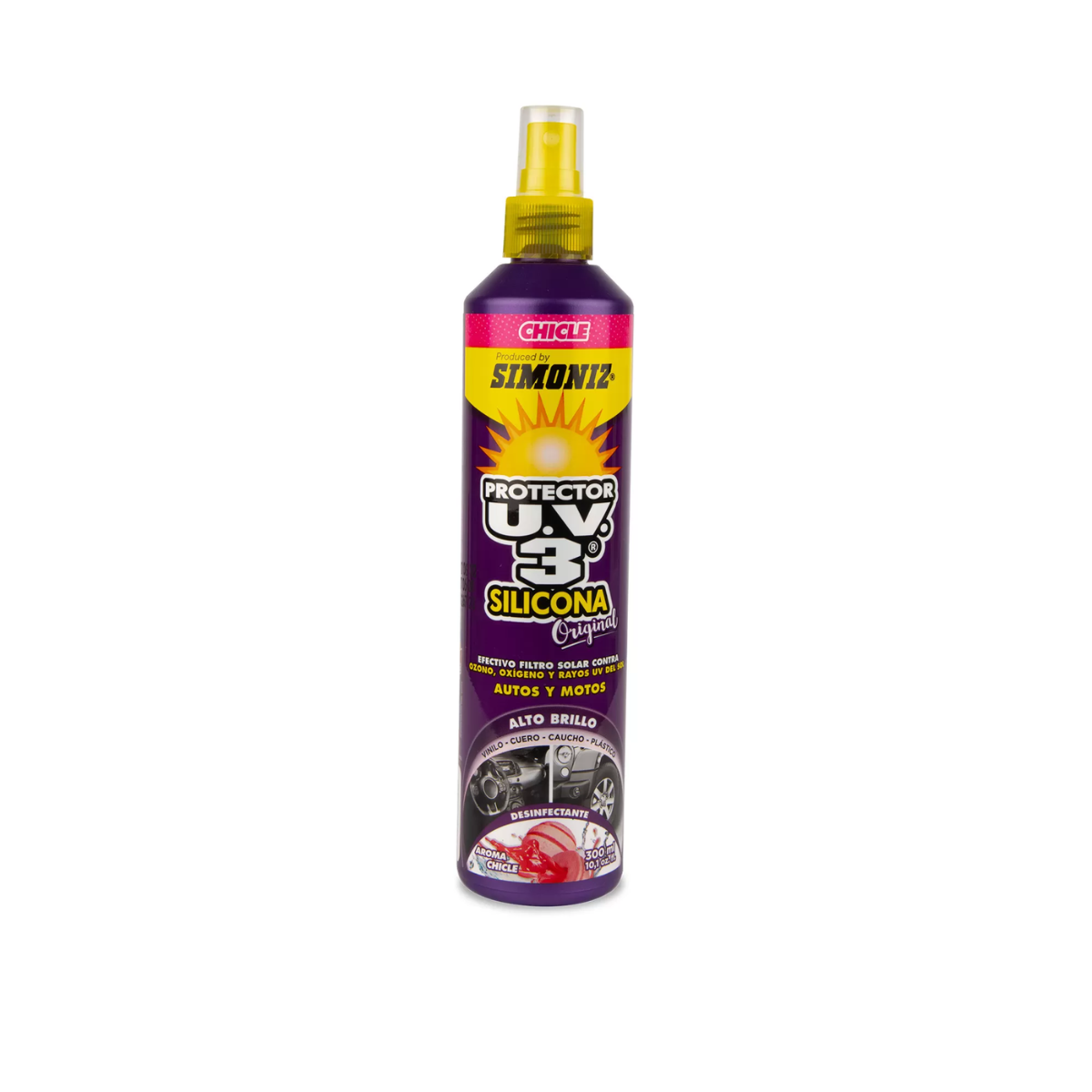 SIMONIZ® PROTECTOR U.V.3® es la única fórmula que mejora la apariencia y previene contra los efectos de los dañinos rayos del sol. Penetra en las superficies de vinilo, caucho, plástico y cuero, proporcionando una poderosa barrera protectora, que revitaliza el color original y da un acabado como nuevo. La barrera protectora de UV3 silicona, protege las superficies de la resequedad, decoloración y agrietamiento.